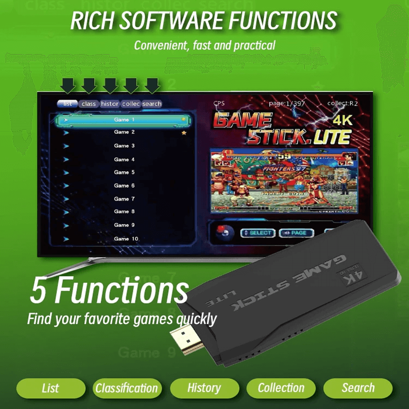 Duik in de nostalgie en herbeleef je favoriete spelherinneringen met onze minigameconsolestick! Dit apparaat neemt je mee terug naar de jaren 90 en 2000 met meer dan 20.000 klassieke games voorgeïnstalleerd, klaar om te spelen.