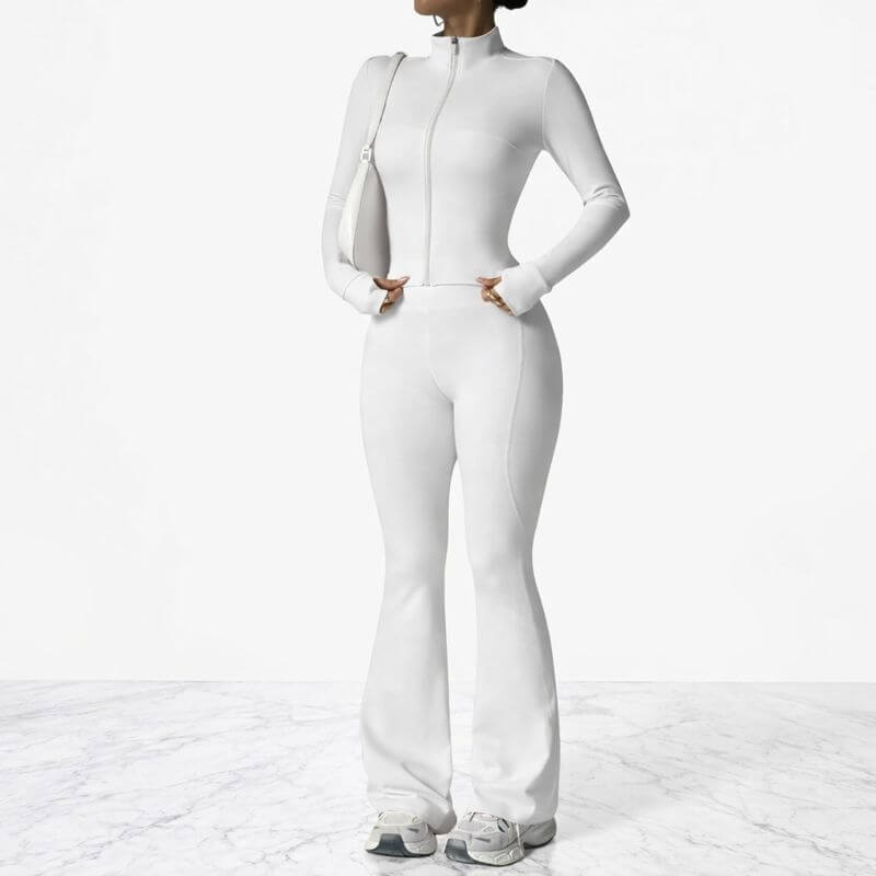 AeroFlare är ett träningsset för kvinnor som kombinerar en slimmad långärmad jacka med dragkedja och tights med lätt utsvängd design. Det är framtaget för att kännas bekvämt och följsamt, samtidigt som det kan ge ett mer genomtänkt och stilrent intryck, både i träningsmiljö och till vardags.