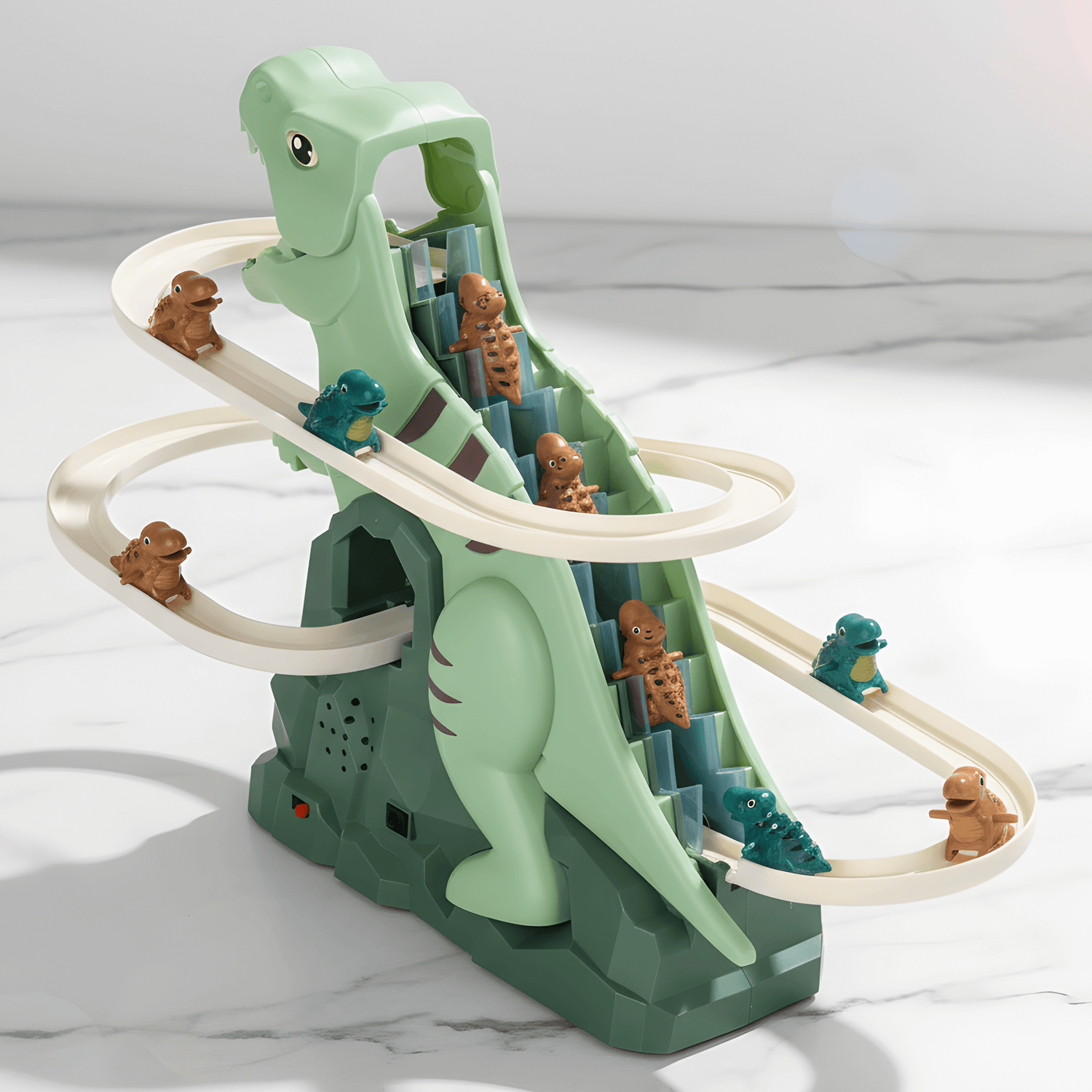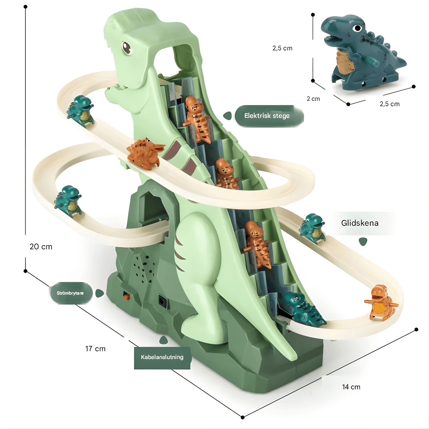 • 🦖 Automatisk klättertrappa – kan låta små dinosaurier röra sig uppför och glida ner i en cyklisk bana