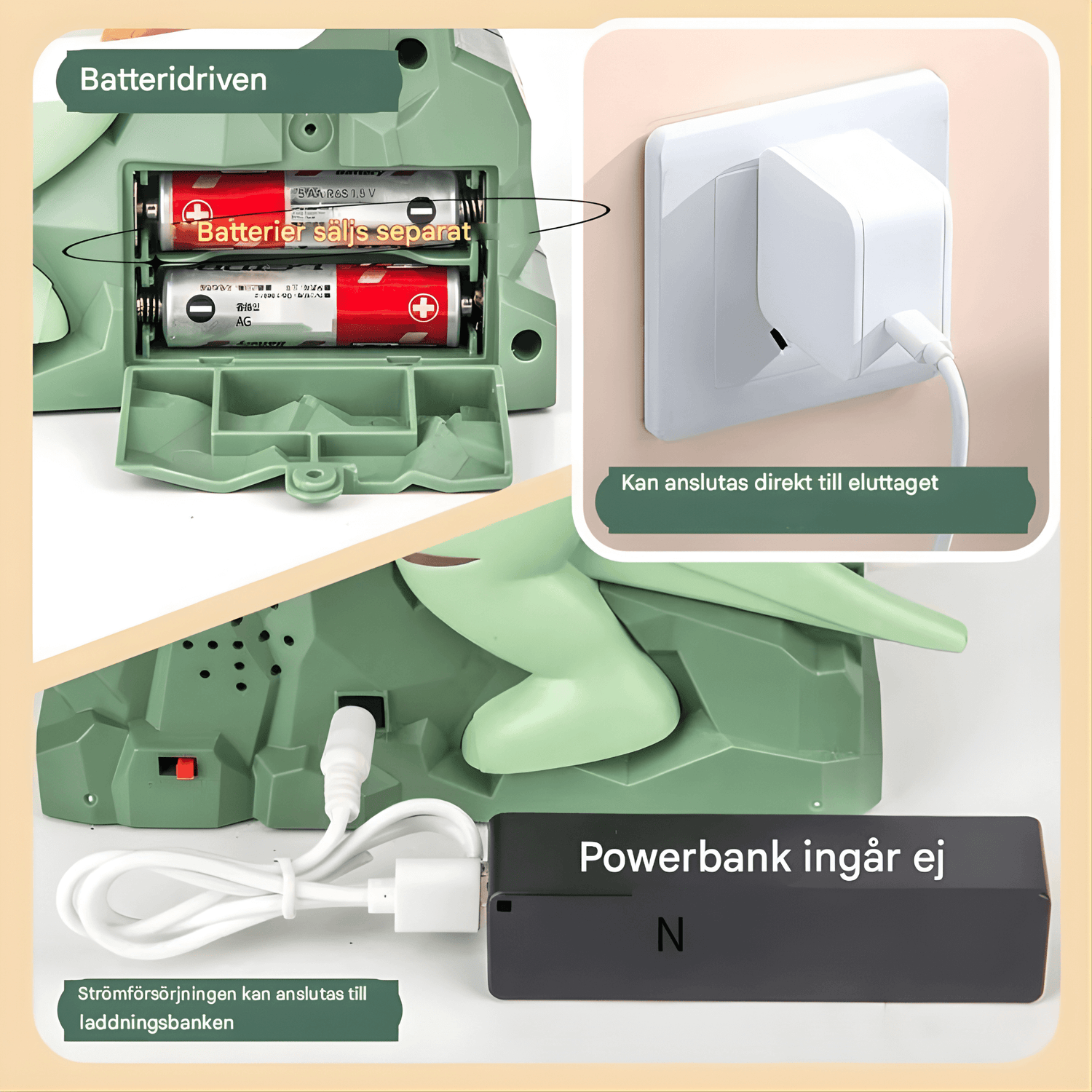 Produkten kan drivas med 2 x AA 1,5V batterier, anslutas direkt till ett hemuttag eller kopplas till en powerbank. Denna flexibilitet kan göra det enkelt att leka både hemma och på andra platser utan att vara begränsad av batteritid, och kan ge fler möjligheter för lek oavsett tillgång till eluttag.