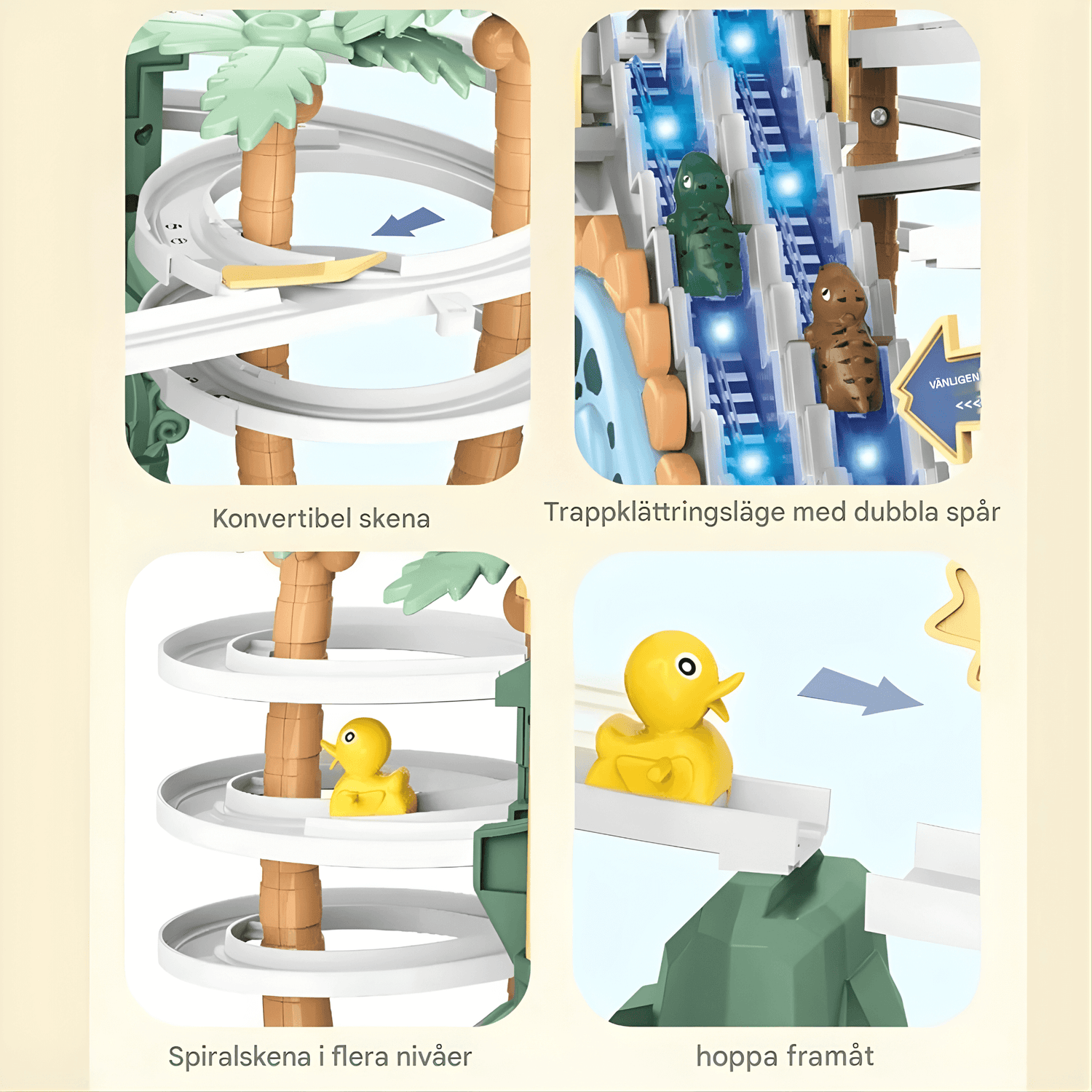 Med DinoTrack kan barn utforska en dubbelbanig rutschkana där små figurer kan klättra upp trappor och glida ner igen. Den dynamiska designen kan bidra till spännande lekstunder, och ljus- och musikeffekterna kan göra upplevelsen mer levande.