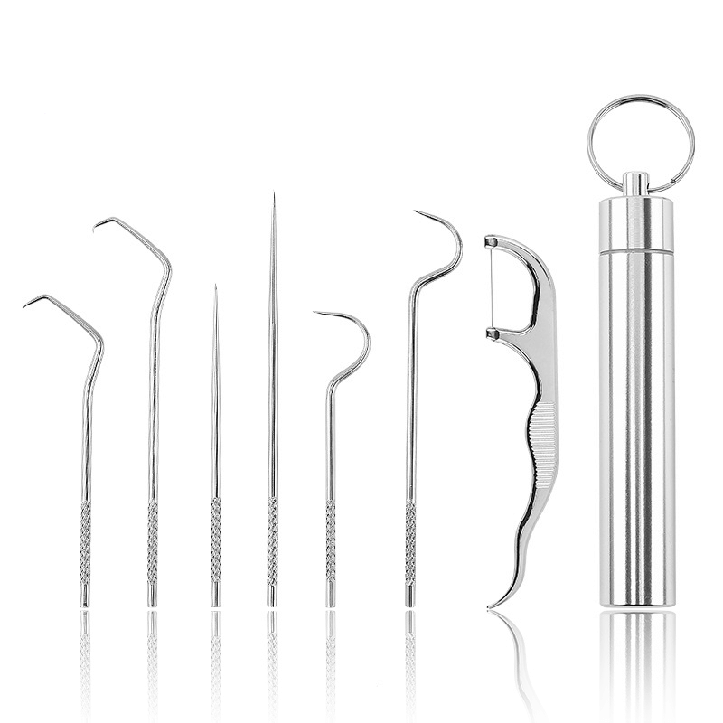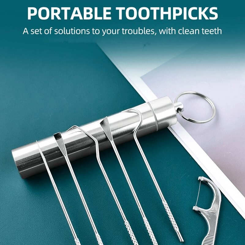 Ben je het zat om je mondhygiëne onderweg in gevaar te brengen? Maak kennis met onze roestvrijstalen tandenstoker set - de ultieme oplossing voor je tandverzorging. Deze tandenstokers zijn gemaakt van duurzaam 304 roestvrij staal en combineren moeiteloos kracht met een elegant ontwerp. Met een 7-delige mondreinigingsset tot je beschikking is het bereiken van een nauwkeurige mondhygiëne nog nooit zo eenvoudig geweest.