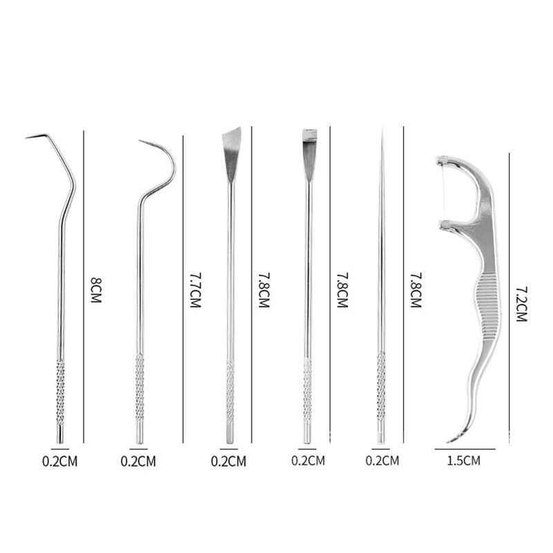 Uitgebreide mondverzorgingsset - Ervaar professionele mondverzorging thuis met de veelzijdige 7-delige mondreinigingshulpmiddelen in deze set. Met verschillende types zijn deze instrumenten vakkundig ontworpen om mondvlekken te verwijderen van moeilijk bereikbare plaatsen tussen de tanden.