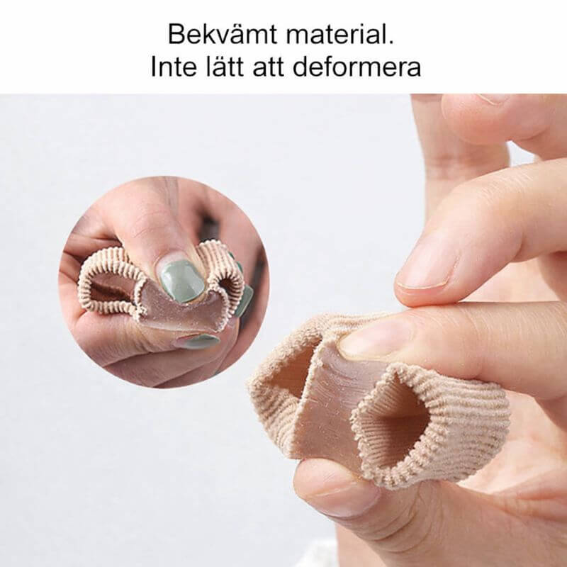 Materialet i ToeAlign består av medicinskt gel-silikon kombinerat med tyg, vilket kan upplevas som mjukt, följsamt och behagligt mot huden även vid längre användning.
